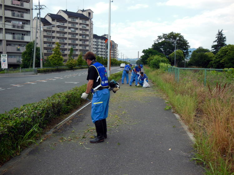 植栽の下草を区間を決めて刈り取り、対象エリア全てのゴミを拾い、路肩を掃きあげました。